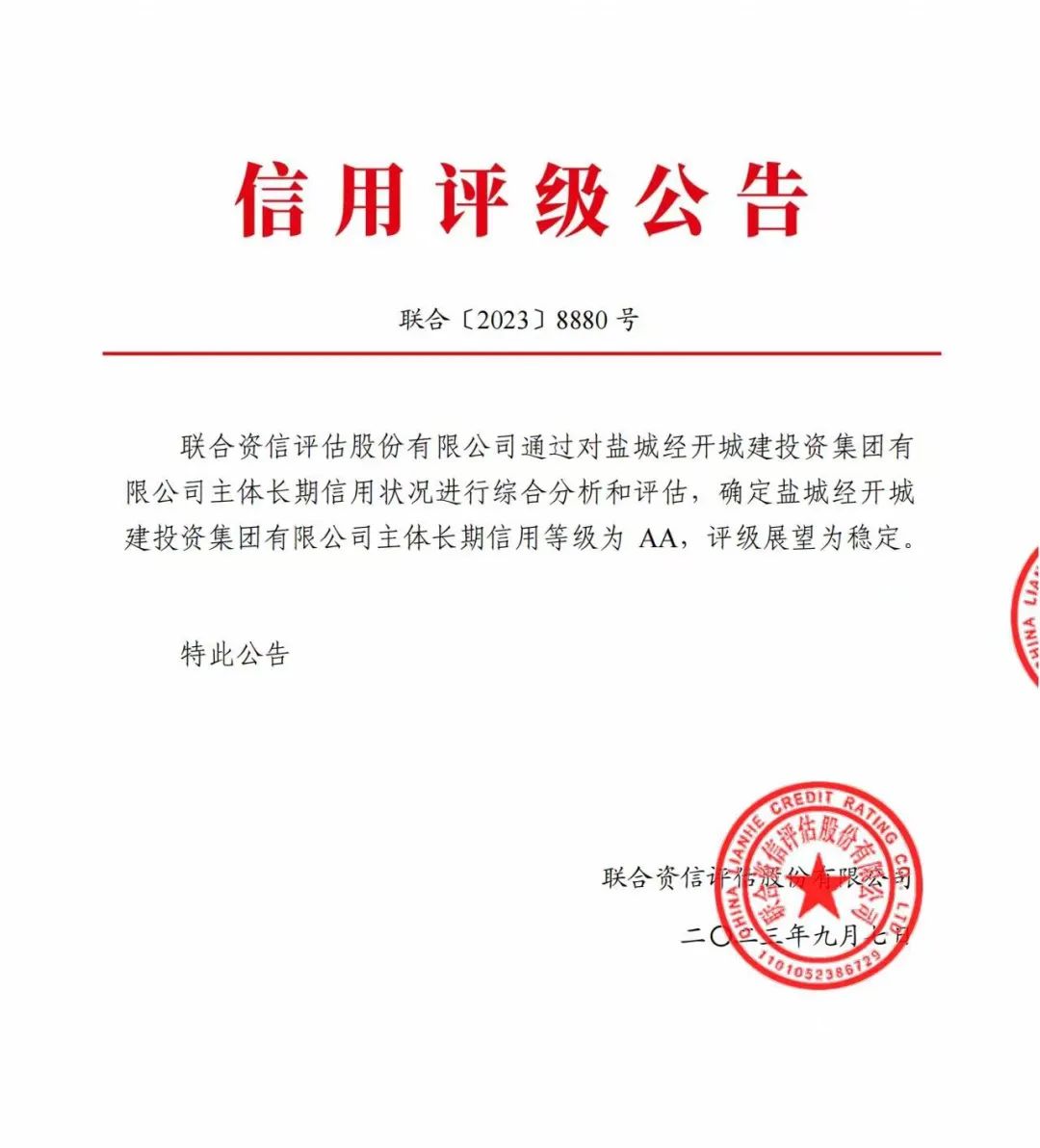 9月7日,经国内权威评级机构联合资信评估股份有限公司(简称“联合资信”)综合分析评定,盐城开云手机平台成功获评AA主体信用评级,评级展望为“稳定”。