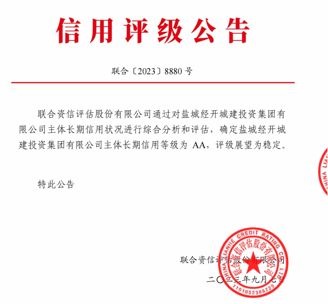 在融资环境复杂多变、评级市场监管日益趋严的大背景下,集团连续获得权威评级机构AA主体信用评级,展现了资本市场对集团业务发展方向、经营管理水平、风险控制能力和未来发展前景的高度认可,彰显了集团的综合实力、影响力和公信力。集团将以此次获评为契机,进一步聚焦主责主业,以重点项目为根基,以经营管理为抓手,以风险防范为底线,不断提高主营业务核心竞争力,为盐城经开区经济社会高质量发展做出新贡献。