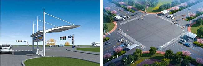 本次四座遮阳挡雨棚采用了无碍交通的设计,占地面积小,不阻碍视野,通透感十足,在保证美观的同时,更加坚实牢固,也增强了市民朋友的视觉安全性。每个遮阳挡雨棚还设置广告宣传灯箱,一方面可以更好的宣传盐城经开区的文明创建工作,让创建更加深入人心;另一方面方便群众过马路在等候放行信号时免受日晒雨淋,便于安心等候,让过往市民感受到城市的人文关怀。