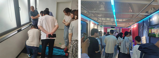 全体人员先后参观体验了气象预警体验、VR火灾隐患排查与火场逃生、全景三维模拟灭火体验、触电体验等专题区,学习了气象灾害、雷雨避险、火灾逃生与自救逃生等相关知识,并体验了火灾逃生、地震避险等模拟演练,综合视觉、听觉、触觉等多方位感受,沉浸式体验各种灾害所带来的破坏力。在心肺复苏与急救专题区,工作人员使用场馆道具,为大家普及心肺复苏术,以防不时之需。此次参观体验,提高了全体员工防灾减灾意识,进一步掌握了避灾、自救、互救技能,有效提升了应对处置自然灾害、突发事件的能力和水平。